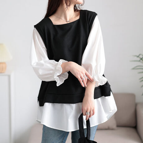 一枚で着映える重ね着風デザインのキャンディースリーブプルオーバーは、モノトーンで落ち着きを感じさせ、異素材デザインでトレンド感漂う一枚。キャンディースリーブで甘さを引き立て、スクエアネックの首元は首長効果を促しすっきりとしたお顔周りを演出し、大人見えに。ゆったりとフレア感のあるシルエットで女性らしい印象が漂います。リラクシーなシルエットに、ふんわりとしたキャンディースリーブで上手に体型カバー。長めの安心丈だから、ヒップラインも隠してくれます。モノトーンの配色デザインでメリハリある雰囲気をプラスし、オンにもオフにもぴったり。