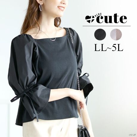 【大きいサイズ】 異素材リボンキャンディスリーブトップス 大きいサイズ レディース トップス 5分袖