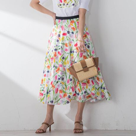 多色のチューリップを使用した作品をプリントした上品なフレアースカート。