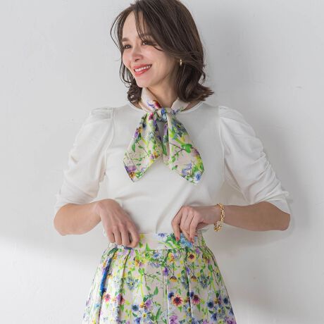KEITA KAWASAKIとのコラボレーションプリントは生花のように瑞々しく、華やかなスカーフに仕立てました。