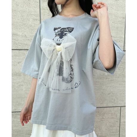 【洗える(マシンウォッシャブル)】チュールリボン付きシュナウザープリントビッグTシャツ
