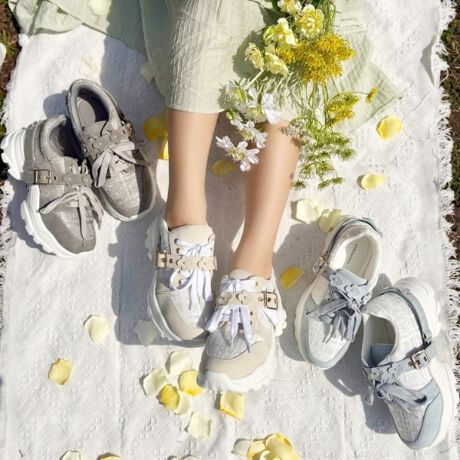 アッパーはラメレース素材を使用し、さらに取り外し可能なフラワーモチーフを付けた2wayのかわいらしいスニーカーです。