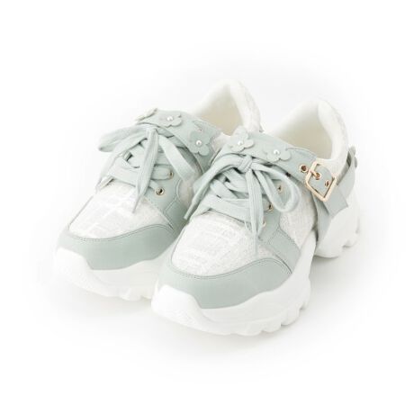 アッパーはラメレース素材を使用し、さらに取り外し可能なフラワーモチーフを付けた2wayのかわいらしいスニーカーです。