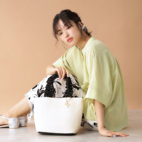 雑材のトートバックにサテンフリルの持ち手が可愛いハンドバッグ。