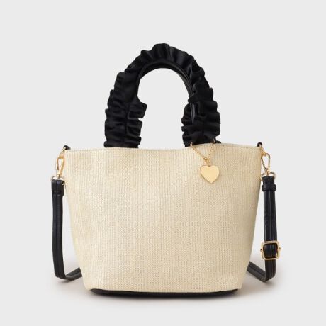 雑材のトートバックにサテンフリルの持ち手が可愛いハンドバッグ。