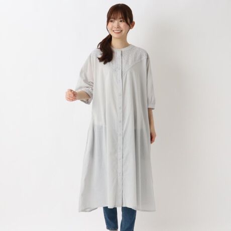 前身頃中心から肩先にかけて刺繍素材の切替を施したワンピースです。