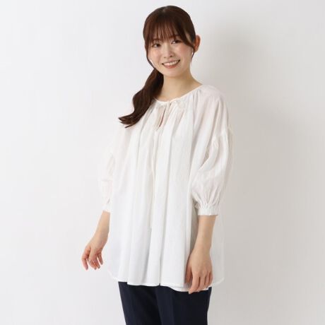 衿ぐりと袖口にたたっぷり入ったギャザーがふんわりと可愛いプラウスです。