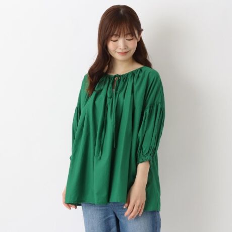 衿ぐりと袖口にたたっぷり入ったギャザーがふんわりと可愛いプラウスです。