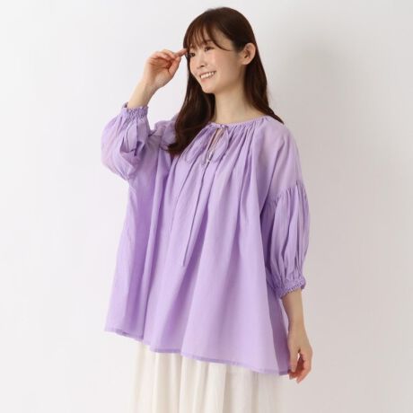 衿ぐりと袖口にたたっぷり入ったギャザーがふんわりと可愛いプラウスです。