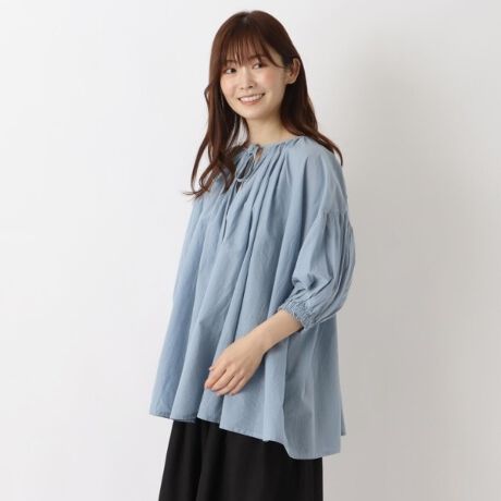 衿ぐりと袖口にたたっぷり入ったギャザーがふんわりと可愛いプラウスです。