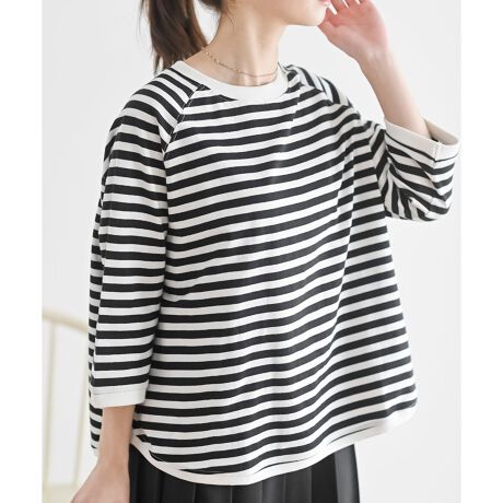 リブ切替7分袖ボーダーTシャツ