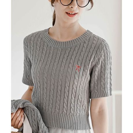 【リボン刺繍ケーブル編み長袖クルーネックニットカーディガン】