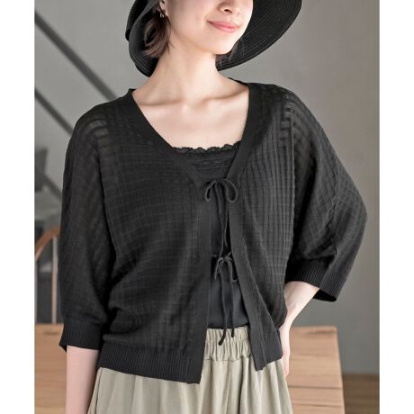 [型番:0800400501]☆2025/SS NEW☆四角い織柄が上品なシアーカーデさりげない透け感が大人女子にも使いやすいシアーカーディガン。格子状の編地が上品な印象を与えます。さっと羽織れるゆったりドルマンシルエット。フロントリボンがフェミニンなアクセントになっています。肌の露出が増える時期にあると便利な1枚。裏地なし伸縮性あり薄手前開きリボン結び編み加減や染めの具合でデザインやサイズ等異なる場合もございます洗濯:手洗い可