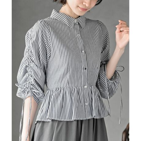 クシュクシュ袖がポイントのペプラムシャツブラウス