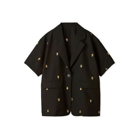 シャツのようにさらっと羽織れる裏なしのテーラード衿のジャケット。ドット絵のようなバラ柄をクロスステッチ刺繍で表現したオリジナル生地を使用しています。トレンドのビッグシルエットでリラックス感ある着こなしができるようデザインしました。同素材のショートパンツとセットアップで着用もお勧めです。