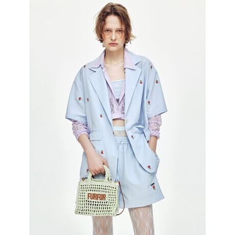 シャツのようにさらっと羽織れる裏なしのテーラード衿のジャケット。ドット絵のようなバラ柄をクロスステッチ刺繍で表現したオリジナル生地を使用しています。トレンドのビッグシルエットでリラックス感ある着こなしができるようデザインしました。同素材のショートパンツとセットアップで着用もお勧めです。