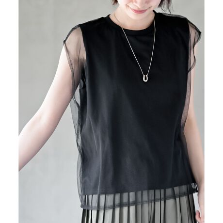 ノースリーブカットソーにチュールを重ねたレイヤード風トップス。
