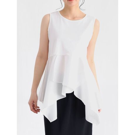 ■レイヤードスタイルに大活躍!裾部分に重ねたフリルが目を惹くデザインノースリーブトップス。
