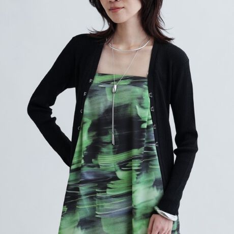 すっきりとしたVネックと、デザイン性をプラスする大き目のホック使いで抜け感を加え、モード感を演出します。