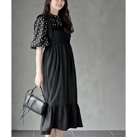 肩リボンシャーリングワンピース