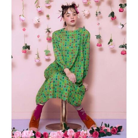 カラフルでホコモモラらしいプリントが印象的なワンピース。一枚着で柄を存分にお楽しみいただけるのはもちろん、デニムジャケットやカーディガンなどの羽織りアイテムをレイヤードしたり、レギンスパンツなどを重ねるのもオススメです。