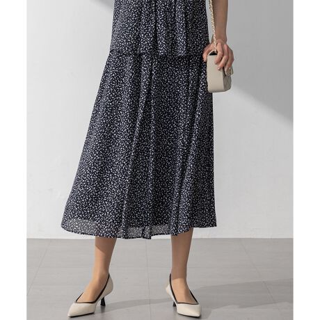 ペイントブラシで描いたようなハケ目が特徴のプリントが施されたフレアスカート。 ブラシのようなハケ目のプリント柄は、素材に動きを出し、柔らかい雰囲気を作り出してくれます。 単色で構成されているため、普段のコーディネートにも取り入れやすいプリントアイテムです。ボックスタックを入れることで、歩く度に裾の動きに合わせて軽やかに広がるドラマティックなフレア感を与えてくれます。後ろにはゴムが入っているため着脱がしやすくなっております。同素材のブラウスと合わせてワンピースのようにも着用いただけます。カラーは優しい色合いのベージュプリント(#533)とシックでモードな雰囲気のネイビープリント(#575)の2色展開です。