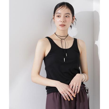 微光沢がキレイめな印象のストレッチポンチ素材のタンクトップ。楽な着心地が嬉しいカップ付きで、肩部分をあえて細めに女性らしいカッティングで仕上げた一着です。