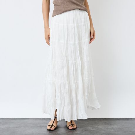 軽く柔らかな素材でクリンクル仕上げでなので広がらず、動くと華やかに揺れる大人なシルエットです。