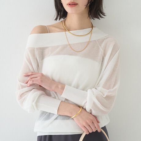 デコルテを美しく見せるシルエットが、女性らしい抜け感を演出します。