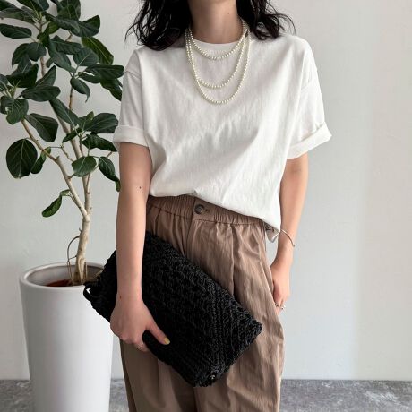 ・首元はすっきりとしたクルーネックで、ネックレスなどのアクセサリーも映えます
