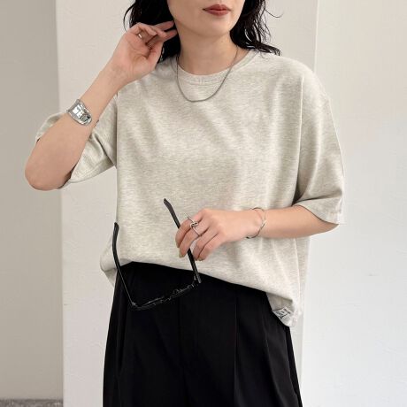 ・首元はすっきりとしたクルーネックで、ネックレスなどのアクセサリーも映えます