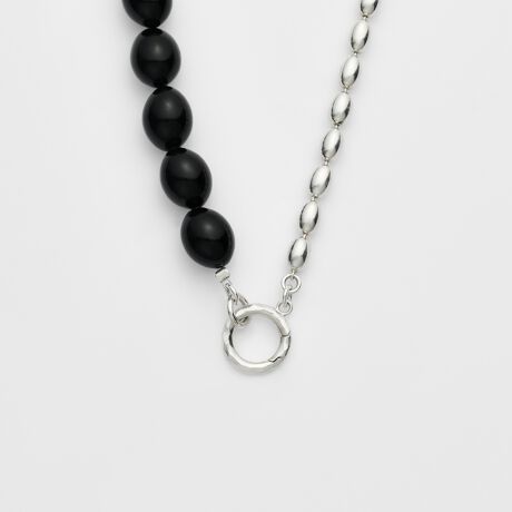 無彩色でまとめたモダンな印象のネックレス。温かみのあるブラックカラーのマリアージュリファインドジェットが全体を引き締め、不揃いのラブラドライトがちょっとした遊び心をプラスしてくれます。ひとつ着けるだけで洗練されたスタイリングを叶えてくれます。※天然石や天然素材を使用しているものは、サイズ・色味・風合いの違いや、若干の傷、内包物の有無などに個体差があります。予めご了承ください。