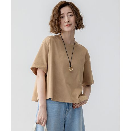 クロップド丈とAラインに広がるシルエットが絶妙なバランスのクルーネックTシャツ。適度なハリ感のある素材をいかし、全体にきれいにフレアが入るように仕上げているため、ボトムにインしなくても決まりのよいバランスです。後ろ襟ぐりには、23区の23をフランス語にした「vingt-trois」の文字が刻まれたゴールドカラーのメタルプレートをあしらい、リッチ感をプラスしました。シンプルなデザインなので短めな丈でも甘くなりすぎず、ボトムのシルエットを選ばずあらゆるアイテムと好相性なので、カラー違いで欲しくなる万能アイテムです。カラーは、清潔感のあるホワイト(#001)、ベーシックなブラック(#005)、ナチュラルな抜け感を演出するキャメル(#034)の3色展開です。