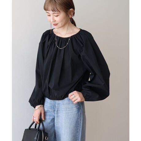 さっぱりと爽やかなテキスタイルで仕立てたデザインブラウス。首元と裾に施したシャーリングゴムのフェミニンなギャザーが存在感をプラスします。シワなりにくく、お手入れのしやすいイージーケアな生地で普段遣いに最適。オフショルダーのヘルシーな雰囲気と旬な短丈シルエットでカジュアルに使えるおすすめの一枚です。