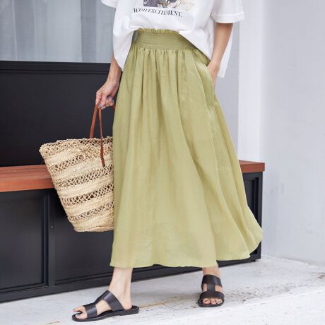 生地を贅沢に使用し、シルエットを出したギャザーロングスカート。