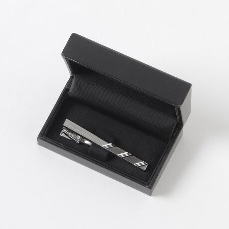 プレートの片側に繊細なカットでストライプを施したシンプルでスタイリッシュなデザインのタイバーです。汎用性が高く、ギフトにもオススメの1品です。