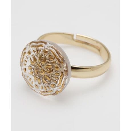[型番:LSJZ5102-2025]チェコのガラスボタンをアレンジした、小ぶりなリング。コーデに馴染みやすいやさしいカラーで、レトロな花柄が素敵。サイズ調整可能です。ガラスボタンは、現地の工房で昔ながらの手作業でひとつひとつ丁寧に作られています。