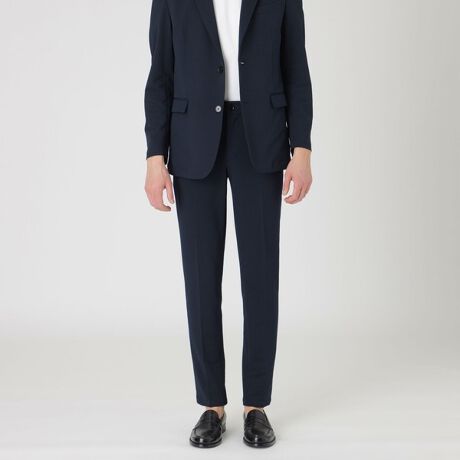 ストレッチ性の高いシアサッカー組織ジャージー素材を使用したトラウザーズです。シャープな印象を持たせる細身のシルエットながらも、ウエスト部分にはゴムシャーリングを施し、快適な履き心地を実現しています。カジュアルからビジネスまで幅広く活躍するベーシックなデザインです。