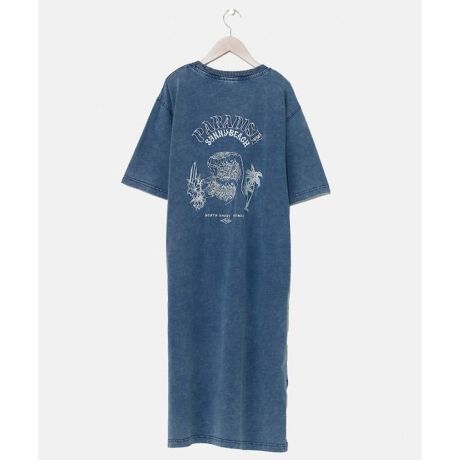 [型番:46R-5102-2025]どんなコーディネートにもあわせやすいデニム風カットソーのワンピース。ウォッシュ加工により、生地が柔らかくなっており着心地抜群です。背中にはサーフカルチャーを感じるデザインの刺しゅう入りです。
