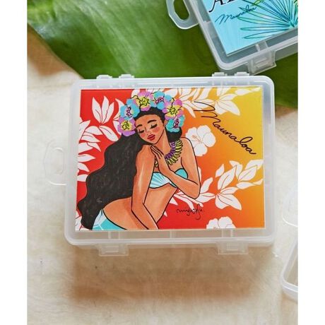人気の'Mighty Su'アート。華やかなステージメイクに欠かせないつけまつげやメイクアップアイテムを収納できるケース。取り外し可能な仕切り付きで、フラダンサーひとりひとりに合わせた使い方ができます。「フラライフをハワイで彩り、心躍る日常を過ごして頂きたい」という願いを込めて、フラダンサーの「あったらいいな」の声を商品化しました。ハワイの海風を感じながら踊るフラガールが目を惹く可愛いデザイン。