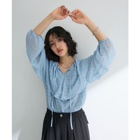 チェックシアーフリルブラウス