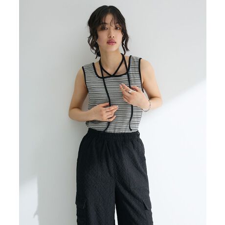 スタイリングのアクセント使いに最適なデザインタンクトップ。チョーカーやホルターなど、ネックに配したリボンで様々なアレンジが楽しめるマルチウェイデザインです。伸びの良いさらりとしたリブニット生地で快適な着心地も嬉しいポイント。色違いで揃えたくなる、ベーシックな無地とマルチボーダーの4色展開です。透け感[なし]