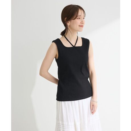 スタイリングのアクセント使いに最適なデザインタンクトップ。チョーカーやホルターなど、ネックに配したリボンで様々なアレンジが楽しめるマルチウェイデザインです。伸びの良いさらりとしたリブニット生地で快適な着心地も嬉しいポイント。色違いで揃えたくなる、ベーシックな無地とマルチボーダーの4色展開です。透け感[なし]