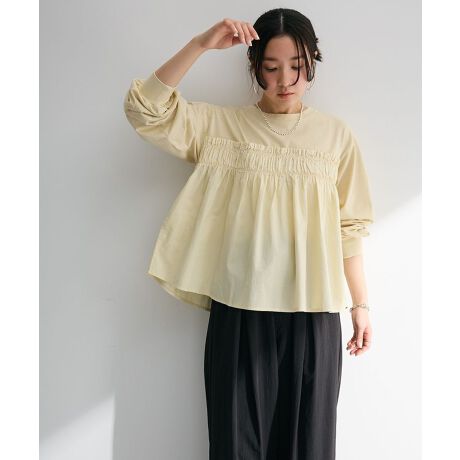 短丈のワイドシルエットにシャーリングデザインが旬テイストなプルオーバーです。ピグメント加工でヴィンテージ感を出しつつ、布帛のフレアシルエットで甘口なニュアンスをプラス。カジュアル×フェミニンなMIXデザインが一枚で着映えを叶えてくれるおすすめアイテムです。透け感[ややあり]
