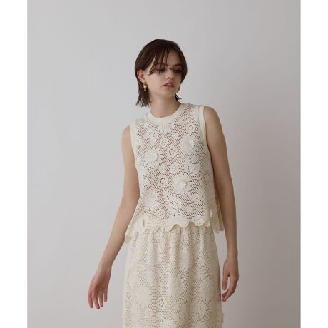 立体感のある刺繍がポイントのクロシェ風刺繍トップス。 ほっこりし過ぎず綺麗めな印象で着て頂ける、大人の女性におすすめしたい一枚です。3D刺繍を飛ばして表情豊かに仕上げつつも、同色で纏めた甘すぎないシックなデザインがポイント。コンパクトなショート丈にスカラップのような波打った裾のシルエットが、フェミニンムードを高めます。涼やかでシーズナブルな装いを叶える、春夏の装いにぴったりなアイテム。お揃いでお作りしたトップスを合わせたセットアップスタイルもおすすめです。