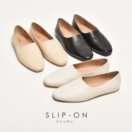 スクエアトゥ 甲深 フラット スリッポンシューズ