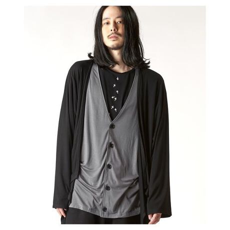 カーディガンとガウンを融合させたレイヤードデザインが特徴のオーバーサイズカーディガン。前後で異なる着丈が独特なシルエットを生み、歩くたびに揺れるドレープ感がエレガントな雰囲気を演出します。柔らかく落ち感のある素材を使用し、フロントボタンとサイドポケットを備えた実用的なディテールも魅力。