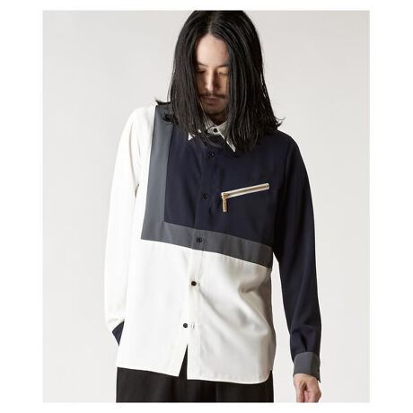 異素材の切替デザインが特徴的なマルチクレリックシャツ。襟、袖口、前立てなどに共地を使用し、統一感を持たせながらもアクセントを効かせたデザインに仕上げています。左胸にはバイアスに配置したZIPディテールを採用し、シャツとしてのシンプルさに独自のエッジをプラス。