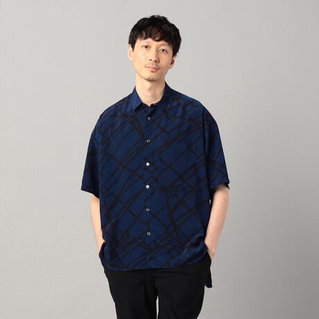 [型番:27-52IK08-205]《デザイン》モダンで洗練されたデザインの半袖シャツです。リラックス感のあるシルエットと軽やかな生地が特長です。大人のスタイルに個性をプラスしてくれるアイテムです。《素材》デシンとしてはやや薄い部類に入る素材です。清涼感があり、しわになりにくく、ドライタッチな素材です。不規則に交差する線が印象的な柄です。手描き風の大理石のようなラインが織りなす独特のリズム感があり、アートな雰囲気を演出しています。