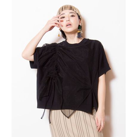 ベーシックなスクエアニットをロマンティックに印象付ける、ギャザーを寄せたエアリーなチュール。